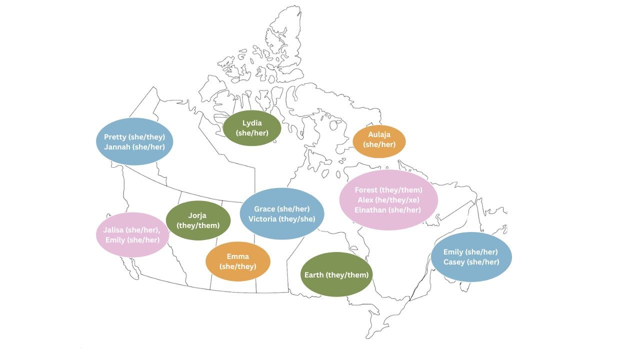 The 16 Youth Co-Researchers bring diverse geographic representation and lived experience, and the majority identify within historically excluded communities, including, 2S/ LGBTQIA+, racialized, and new immigrant persons. Many of the youth co-researchers sit on the National Youth Advisory Board for Action Canada for Sexual Health and Rights; while other youth bring experience with various youth sexual health programs including Wellness Within (Halifax), FOXY- Fostering Open eXpression Among Youth (Yellowknife) and Estelle (Québec). To protect youth’s identities, the YCRs decided to include their first names and broad geographic locations.